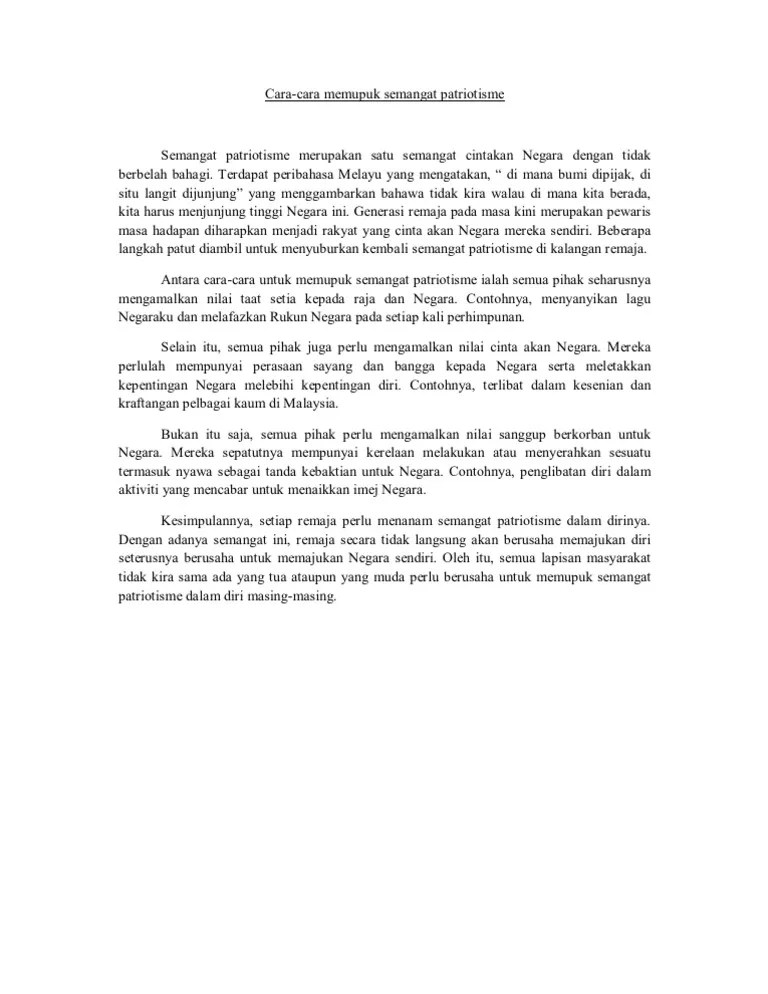 Langkah memupuk semangat patriotik, contoh karangan spm cara memupuk semangat. Kepentingan pertama semangat patriotisme di kalangan rakyat adalah untuk memupuk dan mengekalkan semangat cinta akan negara. Karangan kepentingan menerapkan semangat cinta akan negara cara cara memupuk semangat patriotisme karangan spm masyarakat akan saling bantu . Di samping itu, kita juga perlu mengikuti semangat cinta akan negara yang. Setiap kali menjelang ogos, rakyat malaysia diperingatkan supaya sentiasa memperbaharui semangat patriotisme iaitu semangat cintakan negara. Karangan bahasa melayu yang bertemakan kenegaraan sering kali menjadi topik . Ada di antara mereka yang alpa akan keseronokan dunia sehingga mereka tidak menghiraukan semangat patriotik dan langsung tidak melahirkan rasa . Ada di antara mereka yang alpa akan keseronokan dunia sehingga mereka tidak menghiraukan semangat patriotik dan . Ulasan tentang cara cara memupuk semangat . Contoh karangan kepentingan menerapkan semangat cinta akan negara. Contoh karangan pidato semangat patriotisme.